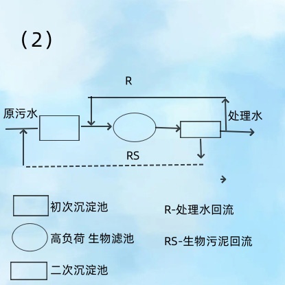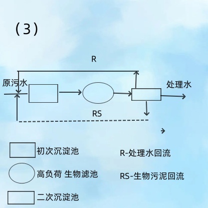 (2)是应用较为广泛的高负荷生物滤池系统。处理水回流滤池前,可避免加大初次沉淀池的容积,生物污泥由二次沉淀池回流初次沉淀池,以提高初次沉淀池的沉淀效果。
